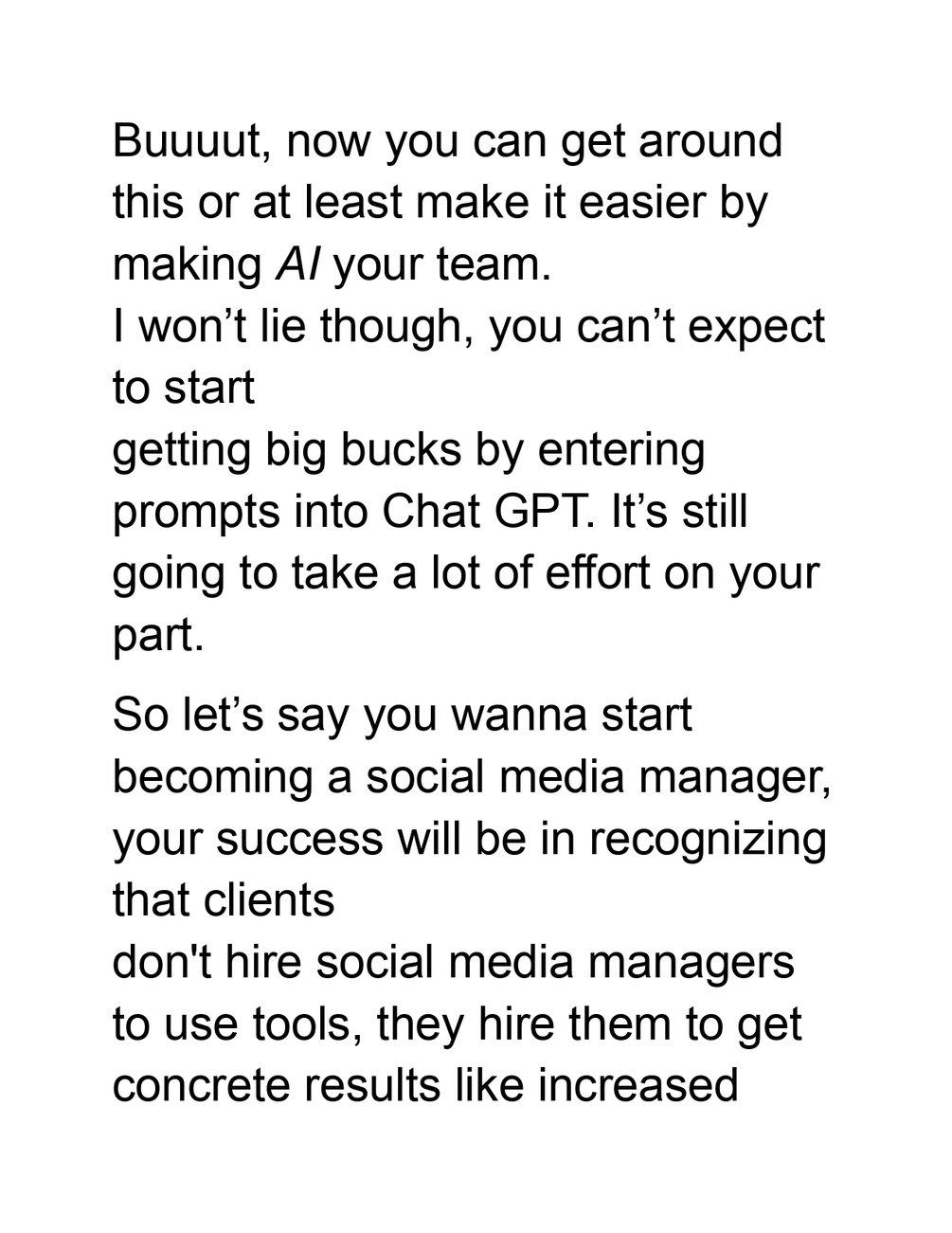 In this no-fluff guide, you'll learn how to become a result-getter, not just a tool-user. Clients pay for increased brand awareness, higher engagement, more leads, and a less stressful life. This ebook shows you how AI helps you achieve that.