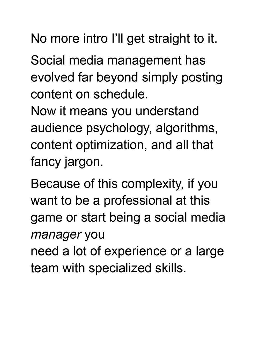 Social media management has evolved. It's no longer just about posting content. To win, you need to understand audience psychology, beat the algorithm, and generate content that actually converts. This used to require a huge team or years of experience. Not anymore.